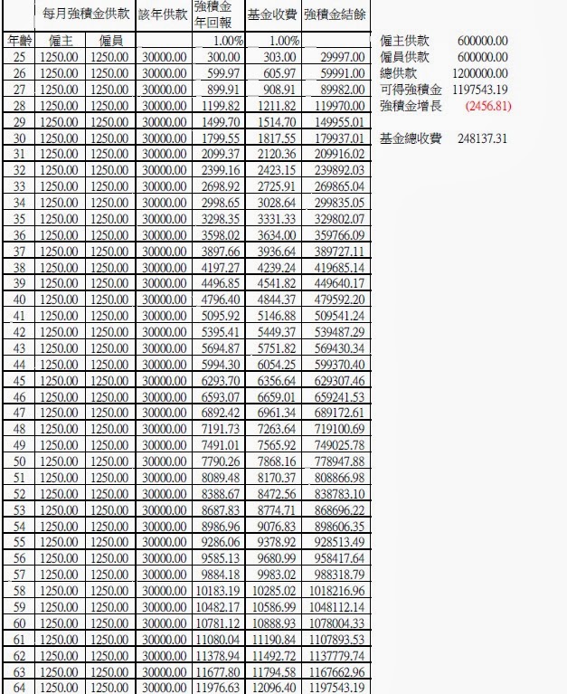 小弟做了一個簡單的 Excel,假設小弟月薪不錯,廿五歲入職時已經有 25K,即是每月強積金供款上限,而且到 65 歲退休時也未曾被辭退過,MPF 未有被「對沖」掉的話,小弟與僱主在 40 年間,各自供了 60 萬元,即是小弟應當有 120 萬作退休吧~